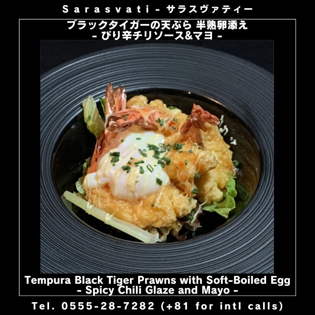 プリっと肉厚なブラックタイガーをカラッと軽やかに揚げた天ぷらに、ぴりっとした辛さがクセになる特製チリソースを絡め、とろ〜り濃厚な半熟卵を添えた贅沢な一品。🍤🥚